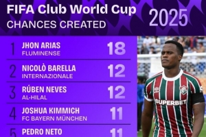 体育资讯7月11日讯 本届世俱杯仅剩巴黎vs切尔西的决赛,数据机构squakwa也统计了本届赛事创造机会情况,弗鲁米嫩塞的27岁前锋琼-阿里亚斯独自领跑。